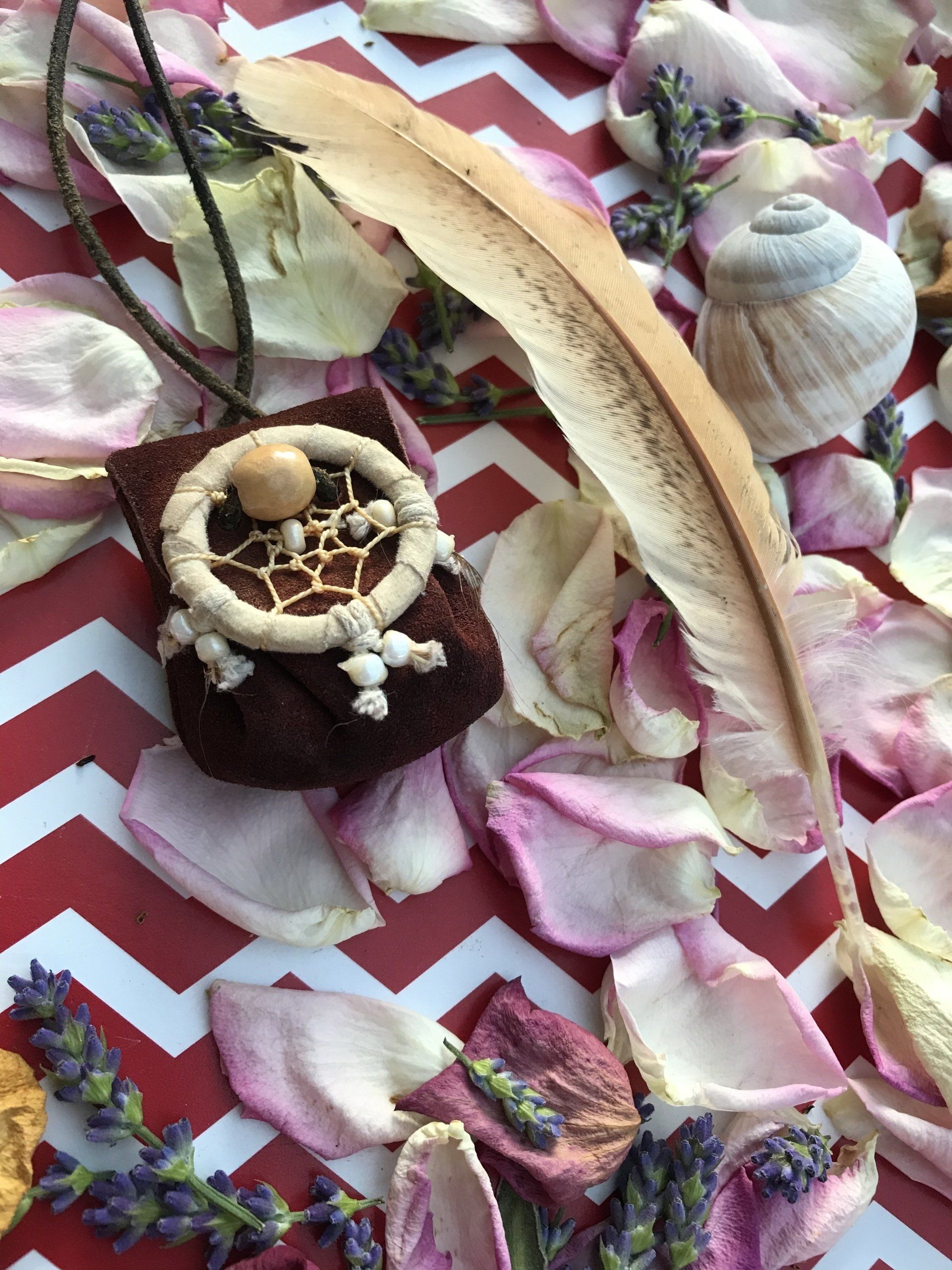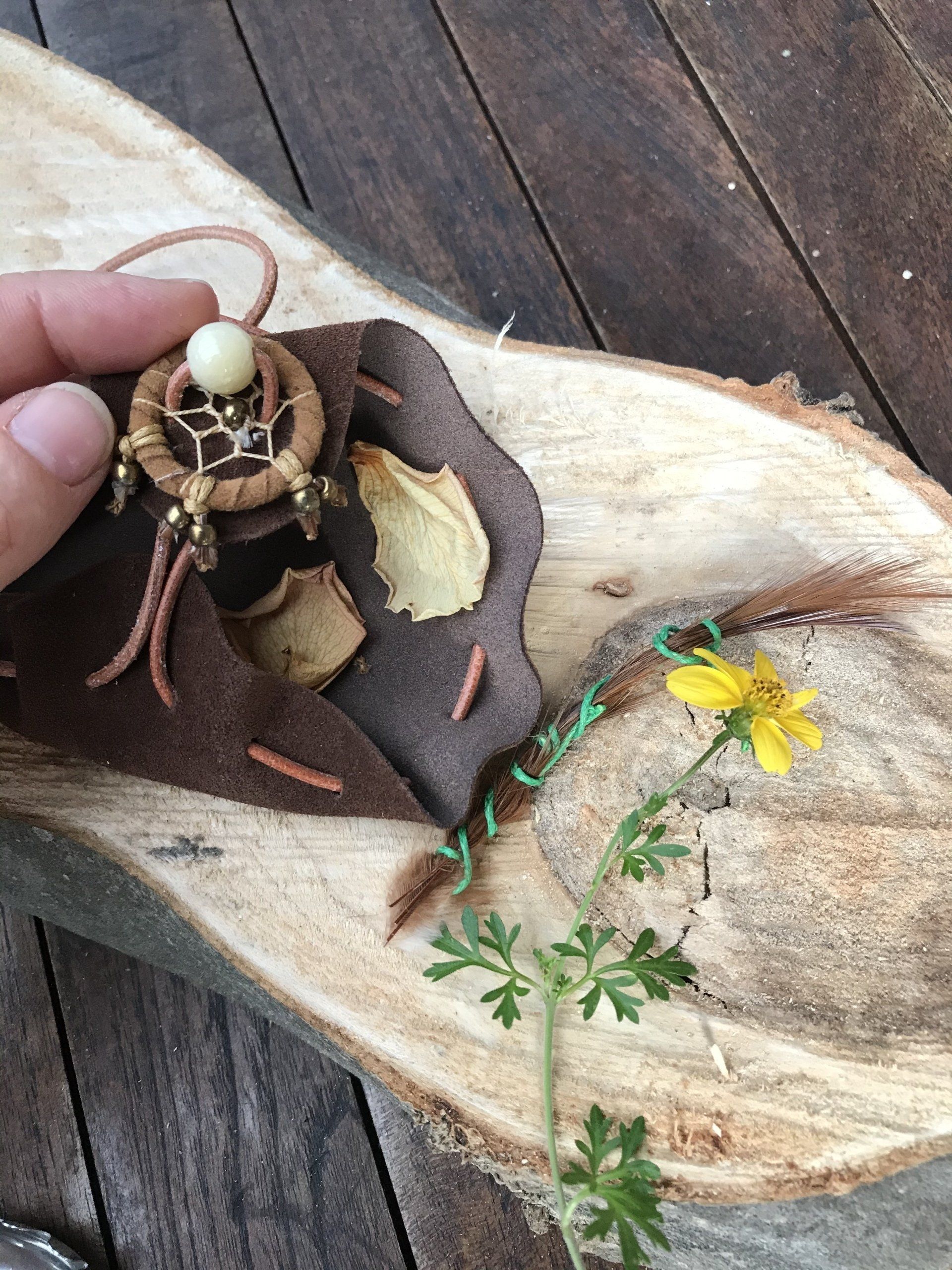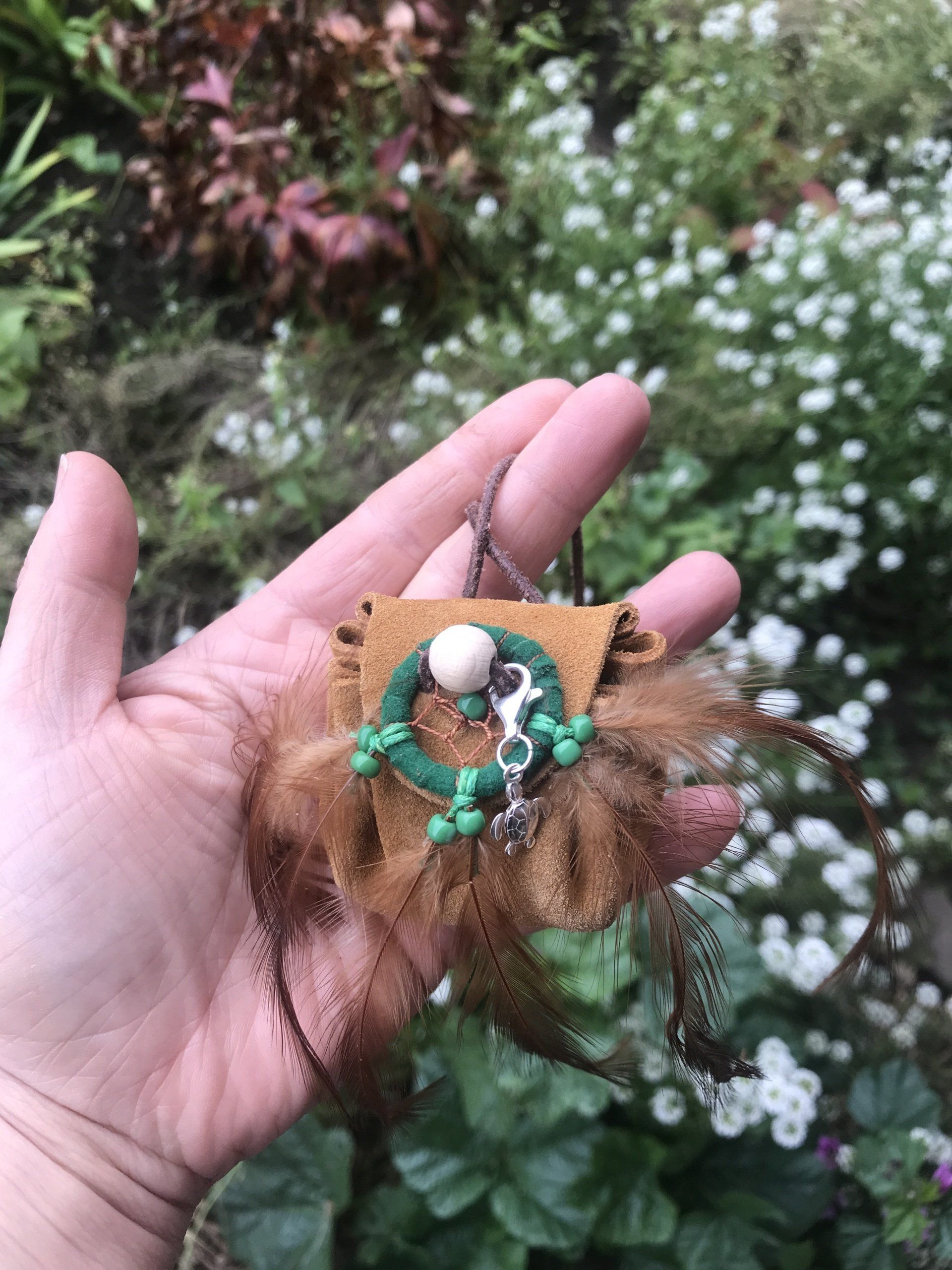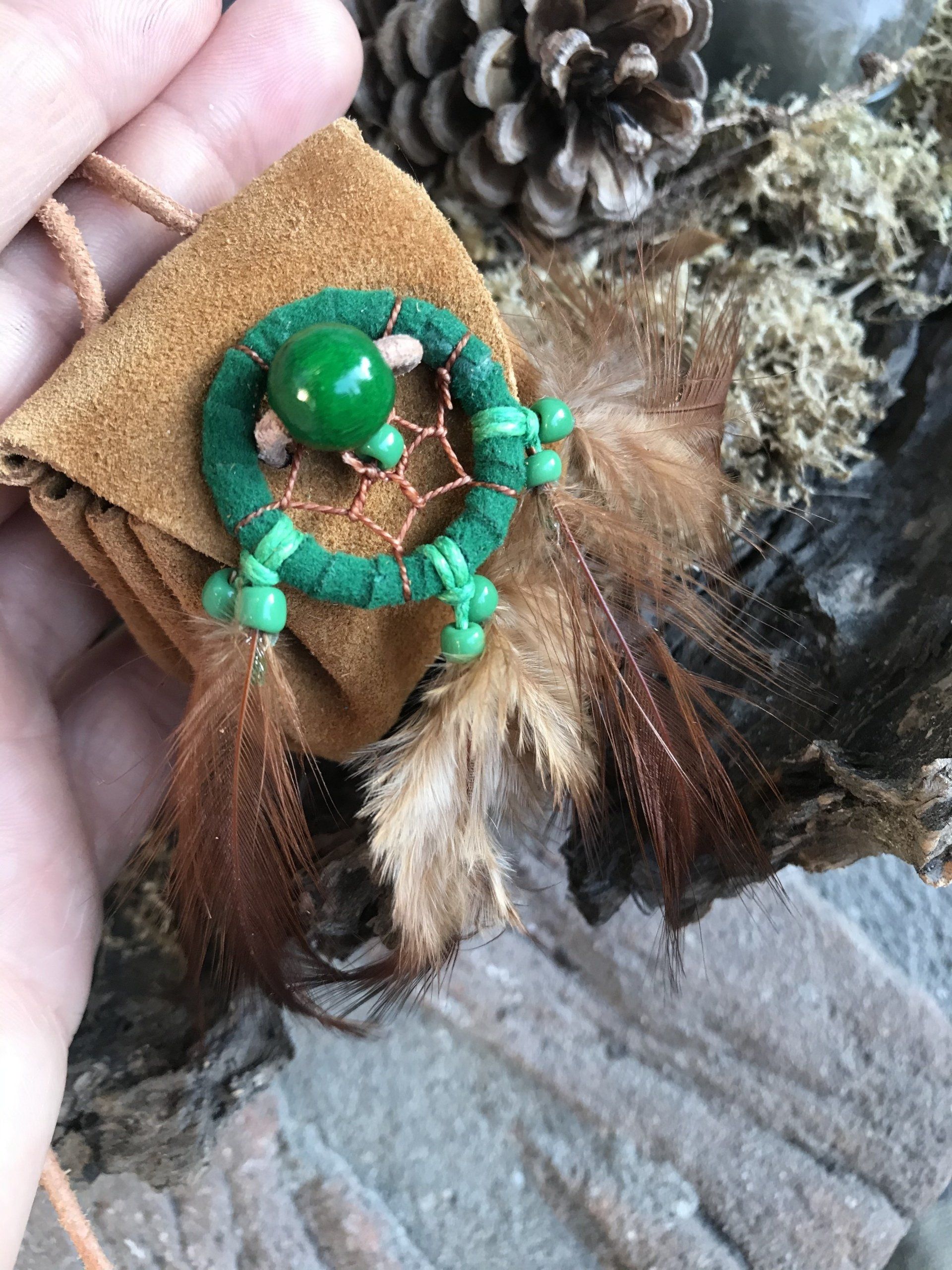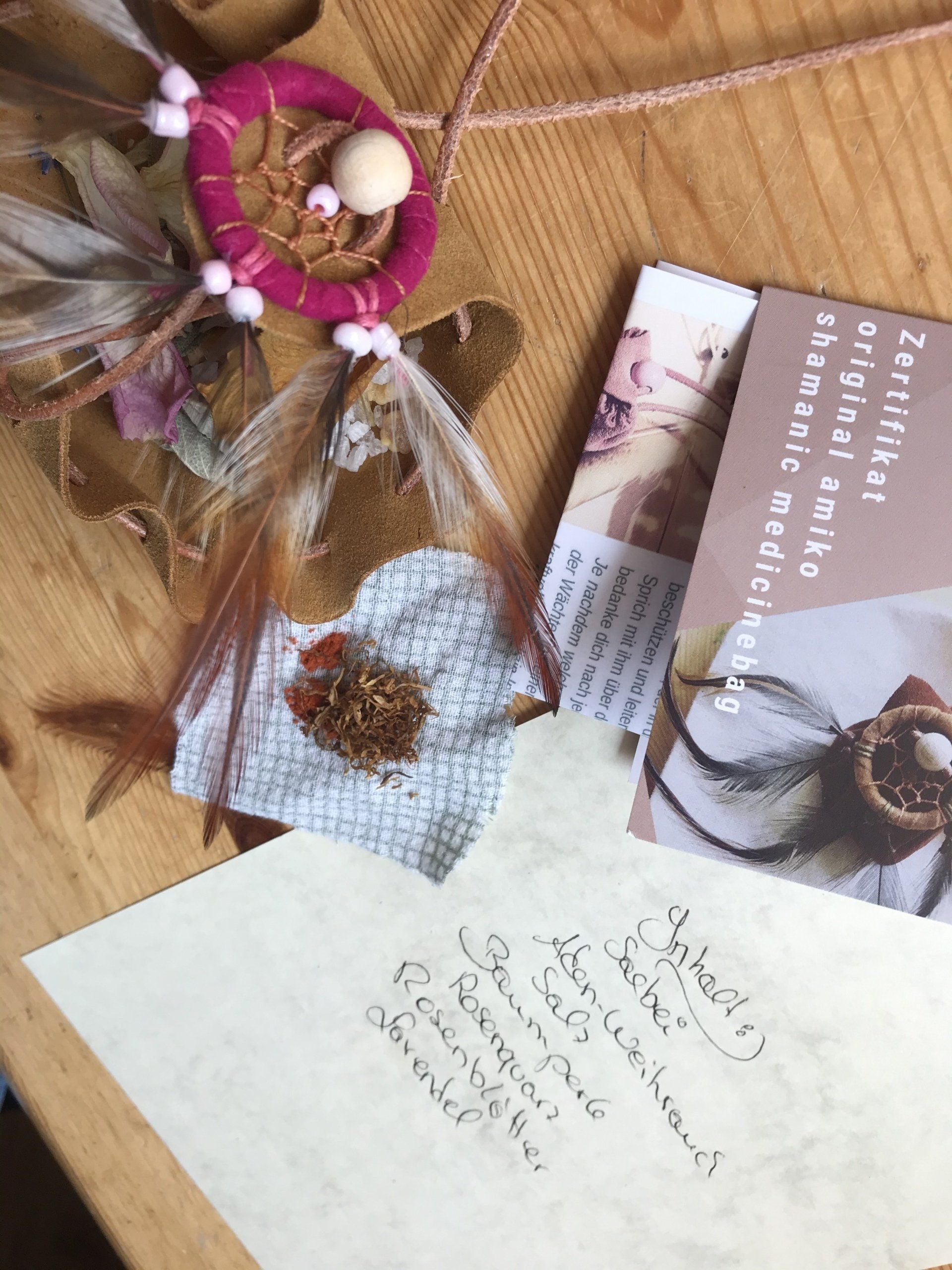 Ganz zwangsläufig ergab sich daraus die Fertigung von kraftvollen Medizinbeutelchen. Diese können nur in Handarbeit hergestellt werden, aus natürlichen Materialien, mit unterschiedlichen Inhalten, aber immer im schamanischen Sinne. Jeder Beutel bekommt in einem traditionellen Ritual einen eigenen Wächter, der für seinen Besitzer arbeitet. Deshalb ist es mir sehr wichtig, dass diese Medizinbeutel nicht achtlos herumliegen oder respektlos behandelt werden.